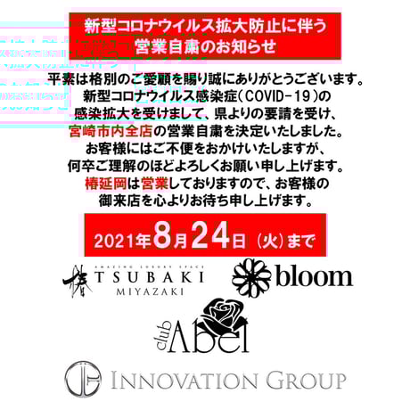 イノベーショングループ全店の営業自粛を決定いたしました。
